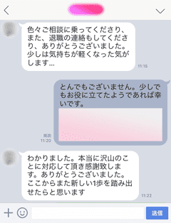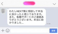 『色々ご相談に乗ってくださり、また、退職の連絡もしてくださり、ありがとうございました。少しは気持ちが軽くなった気がします…本当に沢山のことに対応して頂き感謝致します。ありがとうございました。ここからまた新しい1歩を踏み出せたらと思います。わたしNEXT様に相談して本当に良かったと感じております。また、転職サポートのご連絡ありがとうございます。本当に助かりました…』