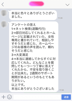 退職者様へ弊社退職代行サービスをご利用後にアンケートをお願いしたところ、以下のようなご回答・評価をいただきました。