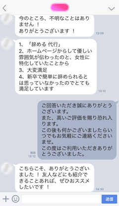 新卒採用のため初めてのご退職でご心配されておりましたお手続きもご郵送でご対応いただけるとのことでしたので、翌週の月曜日からは1度も出勤されずに即日退職することができました。
